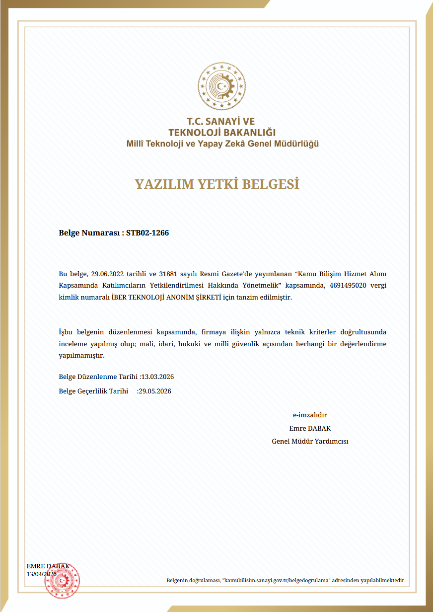 Yazılım Yetki Belgesi, kamu kurumlarının bilişim hizmet alımlarında görev alabilecek firmaların belirli teknik kriterleri karşıladığını gösteren önemli bir yetkilendirmedir. Bu belge ile birlikte İber Teknoloji, kamu kurumlarına yönelik yazılım çözümleri geliştirme ve kamu projelerinde aktif rol alma yolunda önemli bir adım daha atmıştır.