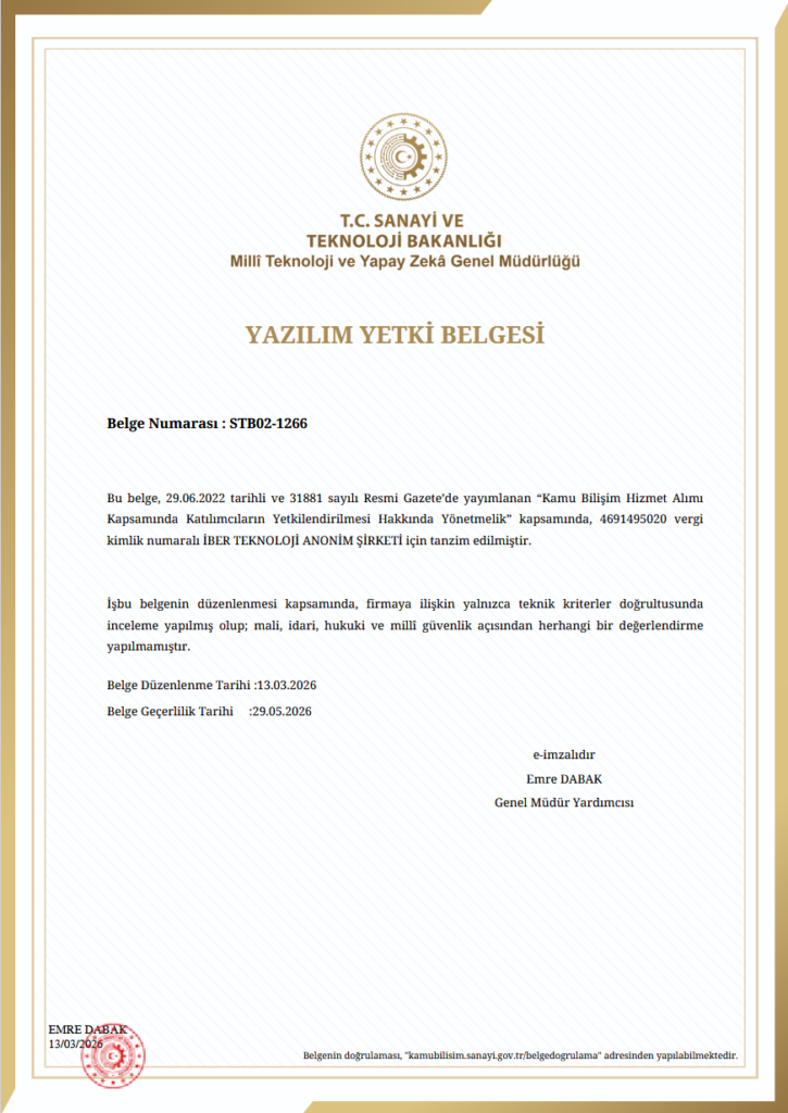 İber Teknoloji continues to strengthen its capabilities and expertise in software development. In this context, our company has been granted the Software Authorization Certificate by the Republic of Türkiye Ministry of Industry and Technology, through the Directorate General of National Technology and Artificial Intelligence.