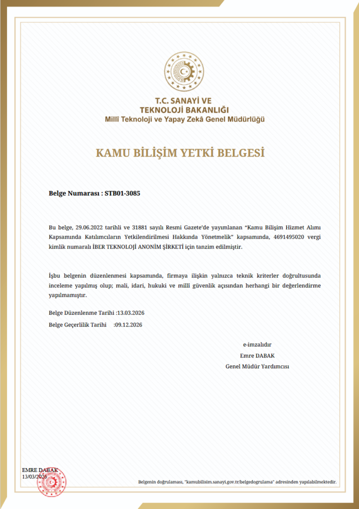 Kamu Bilişim Yetki Belgesi, kamu kurumlarının bilişim hizmet alımlarında görev alabilecek firmaların belirli teknik kriterleri sağladığını gösteren önemli bir yetkilendirmedir. Bu belge ile birlikte İber Teknoloji, kamu projelerinde yer alma ve kamu kurumlarına bilişim çözümleri sunma konusunda önemli bir aşama kaydetmiştir.